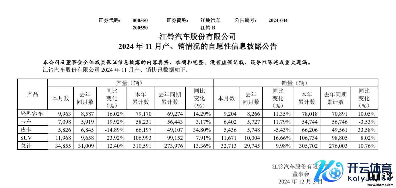 IT之家 12 月 2 日讯息,江铃汽车本日发布公告,其 2024 年前 11 月累计销量 305,702 辆(超 30.57 万辆),同比增长 10.76%;前 11 月总产量 310,591 辆(超 31.05 万辆),同比增长 13.36%。