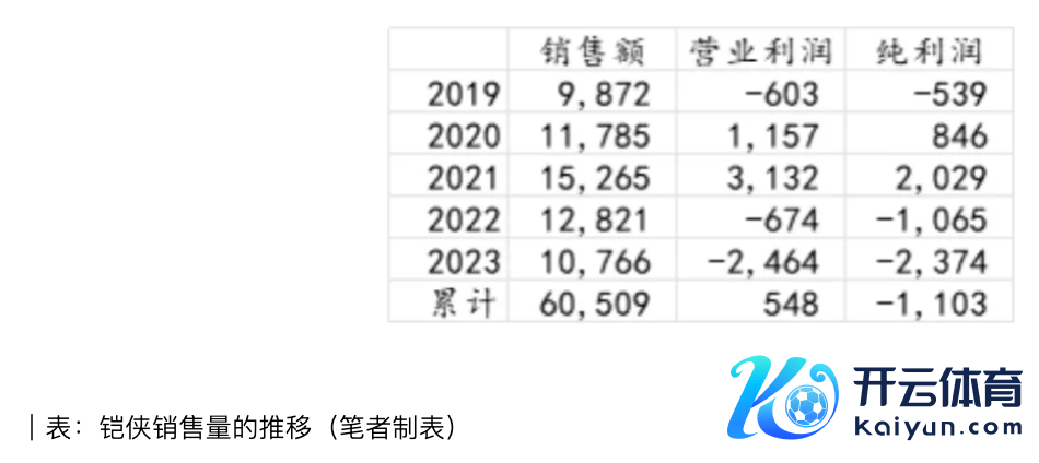 2019年到2023年,从铠侠的销售看,2021年达到岑岭的15265亿日元(约723亿东谈主民币),但到了2023年基本回到了2019年的水平,唯有10766亿日元(约510亿东谈主民币),而况2023年营业利润、纯利润均出现了亏损,其中营业利润亏损2464亿日元(约117亿东谈主民币),纯利润亏损2374亿日元(约113亿东谈主民币)。5年累计已矣营业利润为548亿日元,纯利润亏损高达1103亿日元(约52亿东谈主民币)。