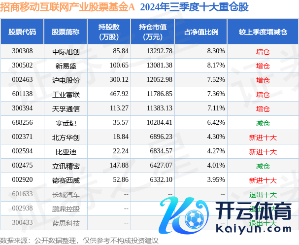 招商出动互联网产业股票基金A为股票型基金,笔据最新一期基金季报显现,该基金金钱建设:股票占净值比92.9%,债券占净值比4.26%,现款占净值比4.69%。基金十大重仓股如下: