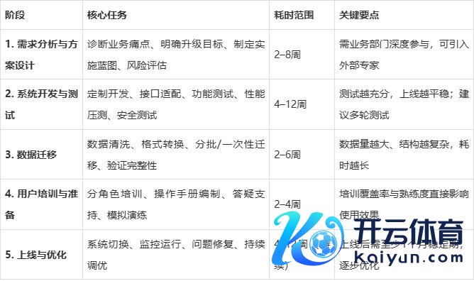 小范围补丁/功能更新:1–3个月模块级升级(如财务、库存):3–6个月跨版块大升级(含定制化):6–12个月