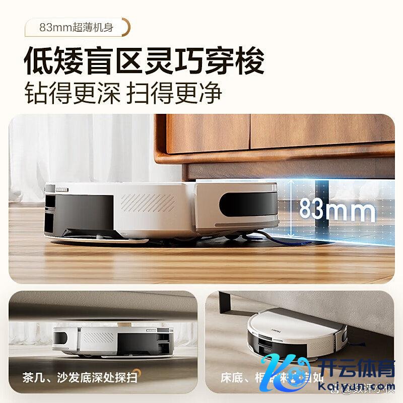3️⃣超薄生动想象:机身高度仅为83mm,任意穿梭于沙发下、床底等狭隘空间,达成无死角清洁。这种超薄想象让您在收拾家务时愈加洋洋万言,不必记念清洁盲区。
